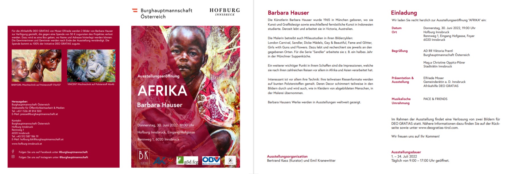 Der Gesamterlös geht zu 100% an die Afrikahilfe, da die Kosten der Ausstellung durch Sponsoren finanziert werden. Danke an die AK Tirol, die ÖBV, die GÖD-FCG Tirol und die Galerie BERTRAND KASS.